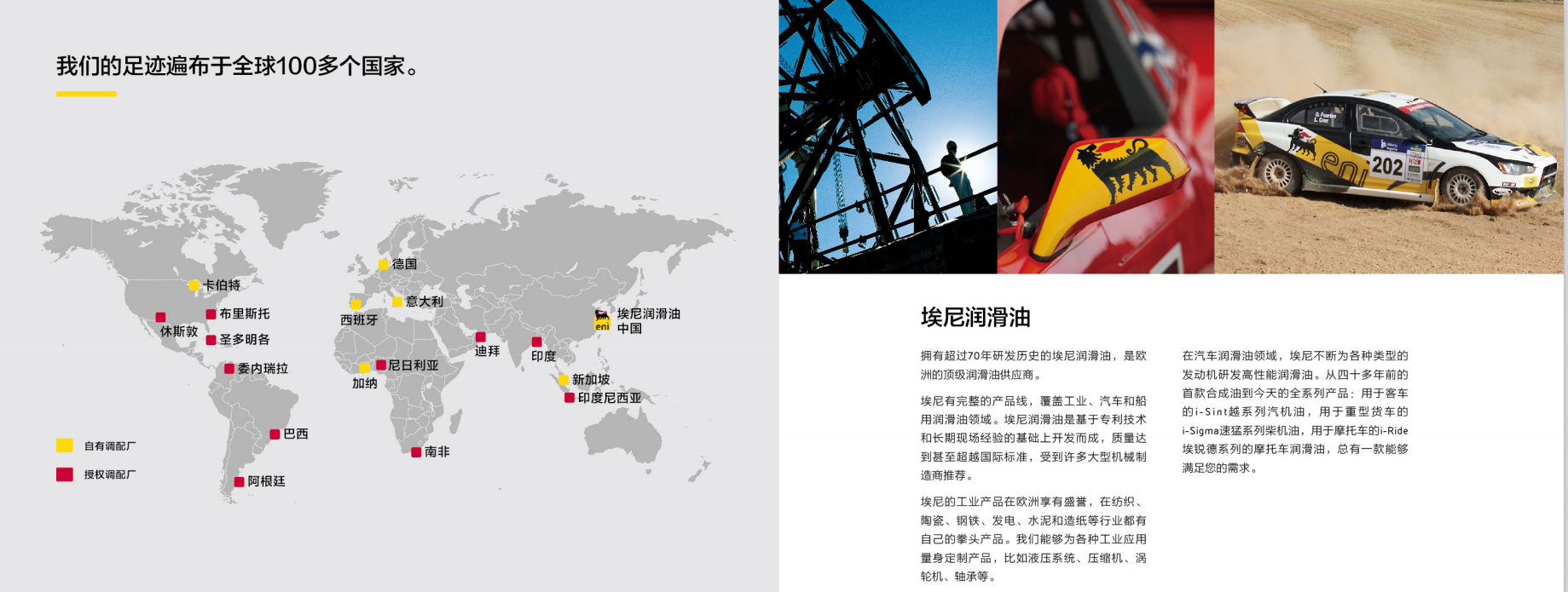 从2012年起,埃尼润滑油贸易(上海)有限公司成立,负责中国市场的润滑油销售活动。